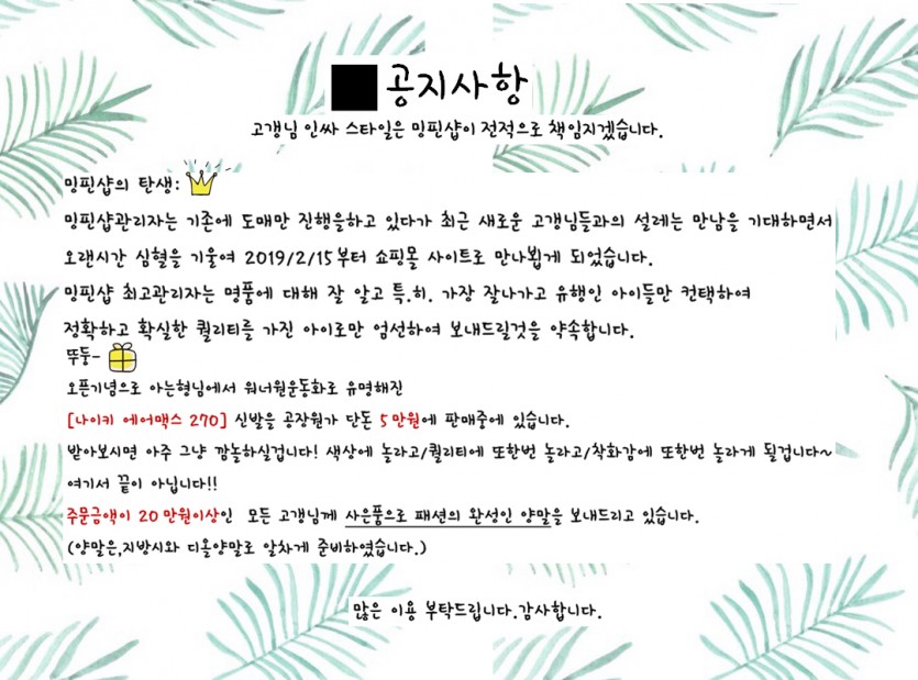 오픈 공지사항 페이지 정보 작성자 밍핀샵 댓글 0건 조회 19,441회 작성일 19-02-11 18:21 본문 밍핀샵 최고관리자 목록 이전글명품의류 품절건 삭제처리중 주문전 재고확인 꼭 해주세요 !! 19.06.18 댓글목록 댓글목록 등록된 댓글이 없습니다.